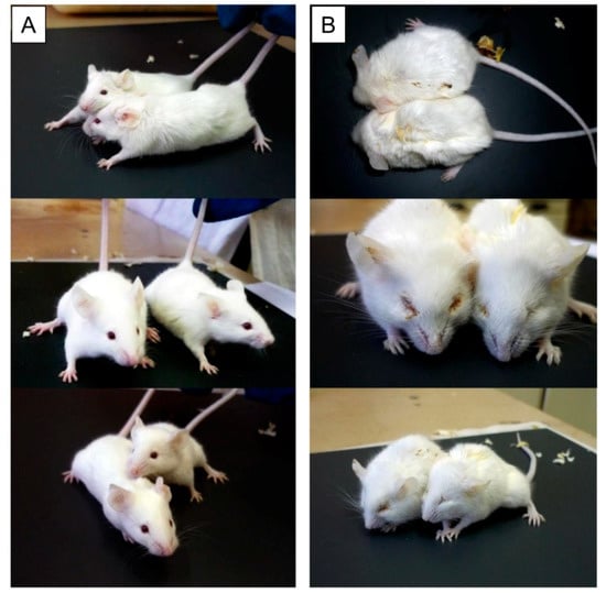 Mice after X-ray irradiation at a dose of 7 Gy (after 7 days). (A) Intravenous administration of Prdx6 before irradiation (20 µg/g), (B) administration of 0.9% NaCl in the same volume. Irradiation of animals was carried out on RUT-15 (Moscow, Russia) at a dose rate of 1 Gy per minute.