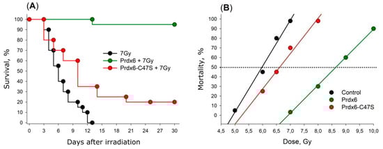 Mutant variant Prdx6-C47S, which has no peroxidase activity, was studied in the same manner. It was surprising that even this variant had a slight radioprotective effect. The results on the survival rate of mice receiving Prdx6 and its mutant form Prdx6-C47S are present in Figure 6A. An average lifespan of irradiated mice was 7 days, and the maximal survival time was 13 days. Prdx6 injection 15 min before X-ray irradiation significantly increased the survival of animals (p < 0.001). Approximately 95% of animals were alive over 30 days. The Figure 6B shows linear dose dependencies of 30-day survival of mice [12]. Dose reduction factor (DRF) for Prdx6 was around 1.4 [110,111].