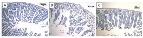 Effect of intravenous administration of Prdx6 (20µg/g) 15 min before exposure to X-ray radiation (dose 10 Gy) on the small intestine morphology. Micrographs of the small intestine stained with hematoxylin-eosin (×100) of (A) intact mice, (B) irradiated mice, (C) irradiated mice that received Prdx6.
