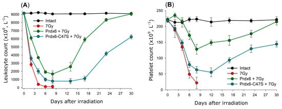 It is known that the death of small laboratory animals (mice and rats) after exposure to ionizing radiation at doses of 3–10 Gy is due to the hematopoietic syndrome as a result of mass death of bone marrow cells [115]. This is also accompanied by a depletion of the bone marrow stem cell depot. As a result, the amount of blood cells in peripheral blood changes, causing immune deficiency and development of haemorrhagia. Intravenous injection of Prdx6 before irradiation significantly decreases the severity of radiation-induced leukopenia and thrombocytopenia (Figure 8) [110,111].
