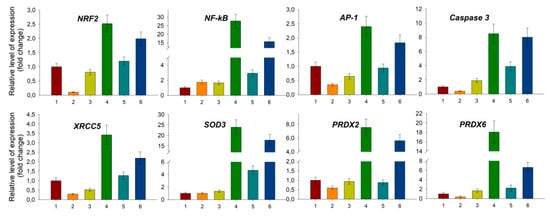 Changes in the expression level of some genes in bone marrow cells 24 hours after whole-body irradiation at a dose of 1.5 Gy and the effect of intravenous administration of Prdx6 and Prdx6-C47S (20 µg/g) 15min before irradiation. The data presented as mean ± SEM (n = 5). 1—intact mice; 2—non-irradiated mice received Prdx6 (20 µg/g); 3—non-irradiated mice received Prdx6-C47S (20 µg/g); 4—irradiated mice; 5—irradiated mice received Prdx6 (20 µg/g), 6—irradiated mice received Prdx6-C47S (20 µg/g).
