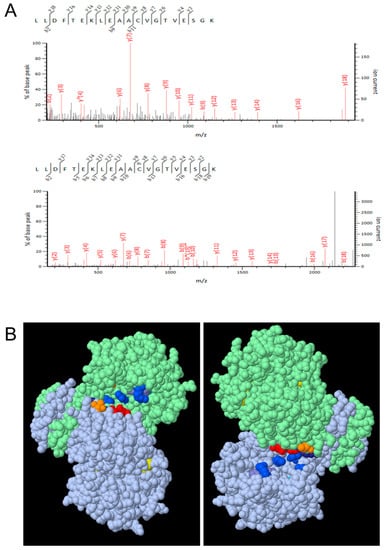 NanoLC-MS/MS data were searched using a local Mascot server (version 2.5.1, MatrixScience, London, UK) in an Arabidopsis thaliana protein sequences database downloaded from the TAIR site (TAIR10 version, Phoenix Bioinformatics, Fremont, CA, USA), to which decoy sequences were added using the in-house developed software tool MSDA []. Spectra were searched with a mass tolerance of 5 ppm in MS and 0.07 Da in MS/MS mode. One missed cleavage was tolerated. Oxidation of cysteine residues were specified as variable modifications. Spectra and fragmentation tables that have allowed identifying glutathionylated peptides are provided.
