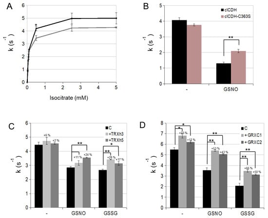 Cysteine-dependent regulation of cICDH activity. (A) ICDH activity was measured for 800 ng of ICDH and ICDH-C363S by monitoring the change in absorbance of NADPH at 340 nm due to the isocitrate-dependent rate of NADP+ reduction at 25 °C in 1 mL reaction medium containing 5 mM MgCl2, 250 μM of NADP+ and different (0–5 mM) concentrations of DL-isocitric acid. (B) ICDH were incubated with 1 mM GSNO and measured in the same conditions than described previously. (C) 800 ng of cICDH were incubated with 0.5 mM GSNO, 0.75 mM GSSG for 15 min at 25 °C. The samples were diluted 2-fold and then incubated with 1 mM NADPH in the presence of NTRA (3 µM) and TRXh3 or TRXh5 (4.59 µM) (D) Same experimental design as in (C), but in presence of GR (0.45 µM), GSH (0.8 mM) and GRXC1 or GRXC2 (5 µM). Error bars represent SE (n = 3). * p < 0.01, ** p < 0.001 for statistical differences compared to non-treated samples (Student’s t test).