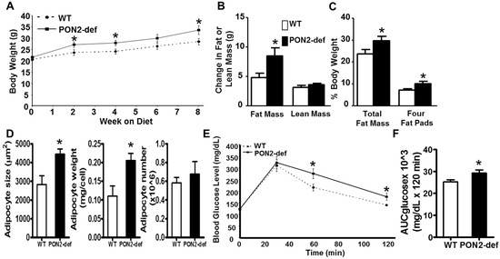 PON2-deficient (PON2-def) mice are more prone to diet-induced obesity and exhibit glucose intolerance. (A) to (D) Two-month-old female PON2-def and wild-type (WT) mice (n = 10 for each group) were fed an obesifying diet for 8 weeks before sacrifice. (A) Body weights of mice at baseline (week 0), 2, 4, 6, and 8 weeks after the start of obesifying diet feeding are shown. (B) Changes in Fat or lean mass after 8 week-feeding of the obesifying diet are shown. (C) Total fat mass and weight of four fat pads (gonadal, mesenteric, retroperitoneal, and subcutaneous fat pads), expressed as % of body weight, at sacrifice are shown. (D) The mean adipocyte size, weight, and number of subcutaneous fat pads are shown. (E) Glucose tolerance test data of WT and PON2-def mice fed the obesifying diet for 7 weeks are shown. (F) Mean AUC data of IPGTT are shown. *: p < 0.05 vs. WT group.