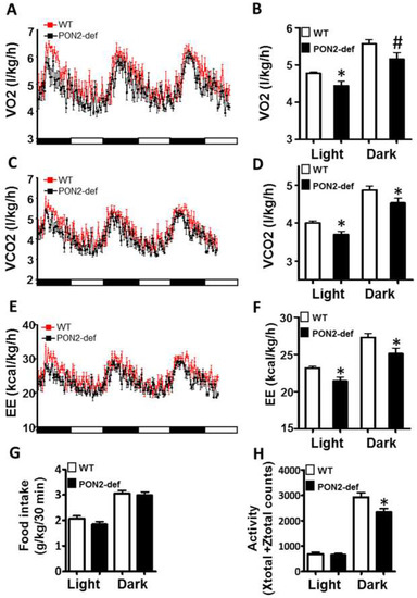 PON2-def mice exhibit altered metabolic phenotypes as compared to the WT mice. Two-month-old female PON2-def and wild-type (WT) mice were fed an obesifying diet for 2 weeks before they were placed individually in metabolic chambers for 3 days to measure metabolic parameters including (A,B) oxygen consumption rate, (C,D) CO2 production rate, (E,F) energy expenditure (EE), (G) food intake, and (H) activity. n = 6 for each group. 12-h light/dark cycles; 72-h total duration; and each light/dark bar represents 12 h duration. After 8 h of acclimation, data from the last 64 h of the 72 h experiment were used for data analysis. #: p < 0.07, *: p < 0.05, vs. WT group.