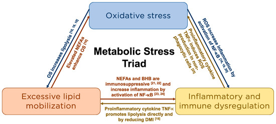 Metabolic stress describes the hypermetabolic catabolic response to this disruption in physiological homeostasis [3] and is characterized by excessive lipomobilization, immune and inflammatory dysfunction, and OS (Figure 1). These three processes are intrinsically linked [16,18,19,20,21,22,23,24,25] and result in immune and metabolic derangements that are associated with an increased risk of metabolic and infectious disease during this period [16].