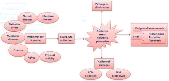 Schematic representation of the relationship among inflammation, oxidative stress, and leukocytes. ROS = reactive oxygen species; ECM = extracellular matrix; RNS: reactive nitrogen species.