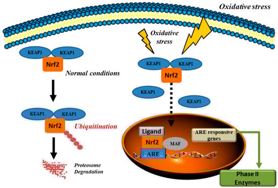 Ubiquitination and proteasomal degradation via the KELCH domain of the KEAP1 homodimer is prevailing in basal conditions. After oxidative stress, Nrf2 is released and translocated to the nucleus where it activates genes with ARE in the promoter region (modified from [135]). KEAP1: Kelch-like ECH associated protein; Nrf2: NF-E2 p45-related factor 2; ARE: antioxidant response element; MAF: musculoaponeurotic fibrosarcoma.