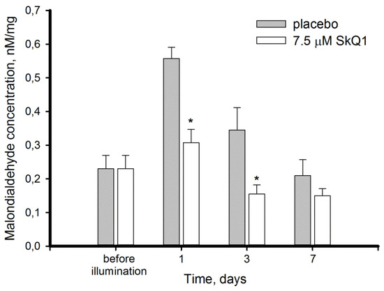 Malondialdehyde (MDA) concentration in homogenates of intact and illuminated rabbit retinas with or without premedication with 7.5 μM SkQ1. MDA concentration was determined by thiobarbituric acid assay. Each bar represents the data obtained from six animals (12 eyes). * p ≤ 0.05 compared with the values measured in the control animals.