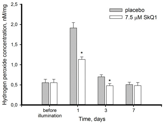 Hydrogen peroxide content in extracts of intact and illuminated rabbit retinas with or without premedication with 7.5 μM SkQ1. Hydrogen peroxide concentration was measured by Fe2+/o-dianisidine/xylenol orange colorimetric assay. Each bar represents the data obtained from six animals (12 eyes). * p ≤ 0.05 compared with the values measured in the control animals.