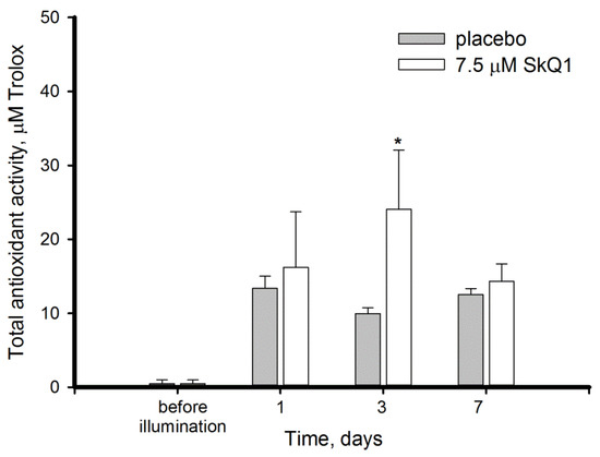 Considering that light illumination induced ROS accumulation and triggered oxidative processes in the retina, we next explored the responses of its intrinsic antioxidant mechanisms to the stress conditions with or without premedication with SkQ1. First, we monitored total AOA of the retinal extracts by hemoglobin/H2O2/luminol assay that detects presumably low-molecular weight ROS scavengers, such as glutathione and ascorbate. Unexpectedly, no latency of luminol oxidation was detected in the presence of intact retina extracts indicating very low AOA, the level of which likely remained beyond the method detection limits (Figure 4). However, the illumination resulted in an increase of AOA in the retina, although it remained significantly lower than that in the other eye tissues measured by the same method [34,38]. SkQ1 had a moderately positive effect on this increase, especially on day 3, when AOA in was 2.4-fold higher than in placebo group.