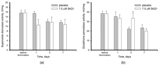 In addition to the total AOA, the activity of antioxidant enzymes was reliably changed upon the pronounced light-induced oxidative stress in the retina. Thus, in the placebo group the activity of SOD and GPx concomitantly decreased on day 3 post exposure by 21% (Figure 5a) and 57% (Figure 5b), respectively. Both enzymes remained downregulated during the next 7 days reflecting long-term response to the oxidative stress. Yet, the impacts of premedication with SkQ1 on these enzymes were small and possessed a different tendency. Thus, no statistically significant effect of the antioxidant towards SOD was found, although a slight decrease in activity of the enzyme could be noted in the premedicated animals already on the first day after illumination. By contrast GPx activity was likely sustained at normal level until day 7 of the post-exposure period.