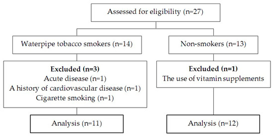 Twenty-three young women, including 11 WPT users (5 to 9 uses per week) and 12 non-users, were selected from a total of 27 volunteers according to the entry criteria, i.e., no regular exercise training in the last 3 months, no current pregnancy, lack of any oral infection and acute disease, and no signs, symptoms, or history of cardiovascular, respiratory, and musculoskeletal diseases. All participants did not use drugs in the past month and supplements known to affect the results (i.e., vitamin supplements) in the past six months. WPT smokers also did not smoke tobacco products other than hookah (Figure 1).