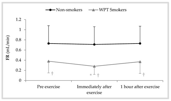 Saliva flow rate (FR) following a bout of exhaustive aerobic exercise for WPT smokers and non-smokers; * p < 0.05 vs. pre, † p < 0.05 vs. non-smokers.