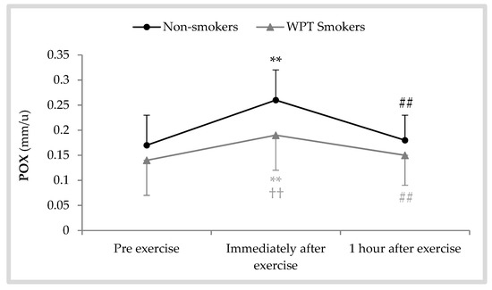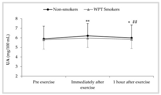 The results obtained in the present study revealed that the responses of salivary POX activity and DPPH radical scavenging activity in WPT smokers were weaker than in non-smokers, particularly immediately after exercise. It was also observed that the responses of salivary UA could differ between WPT smokers and non-smokers during the recovery period after an exhaustive AE. In comparison to WPT smokers, non-smokers experienced a larger increase in POX activity (around 23% vs. 14%) and a smaller reduction in DPPH activity (around −8% vs. −15%) immediately after exercise. Moreover, UA concentrations in non-smokers tended to be higher than in WPT smokers following exhaustive AE, but the differences were not significant.