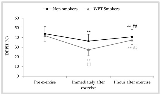 As shown in Figure 5, a significant effect of the collection time existed for the percentage of DPPH radical scavenging activity [F (1.37, 30.21) = 71.22; p < 0.001; η2 = 0.76]. DPPH activity was decreased significantly in both WPT smokers (immediately after exercise: −14.63 ± 5.20; p < 0.001, 1 h after exercise: −4.63 ± 3.26; p = 0.002) and non-smokers (immediately after exercise: −7.66 ± 2.38; p < 0.001, 1 h after exercise: −3.16 ± 1.52; p < 0.001). However, the observed differences between the groups were found to be statistically significant only immediately after exercise (p = 0.004).