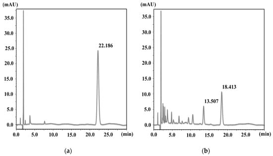 HPLC chromatogram of the (a) NX solution and the (b) NX solution after UV irradiation for 3 h.