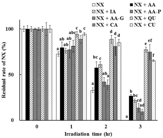 The photoprotective effects of other antioxidants, including IA, AA-P, AA-G, QU, CA and CU, on NX photodegradation were determined and compared to AA. A comparison of the residual rate of NX after UV irradiation up to 3 h in the presence of each antioxidant at a concentration of 100 µmol/L is shown in Figure 6.