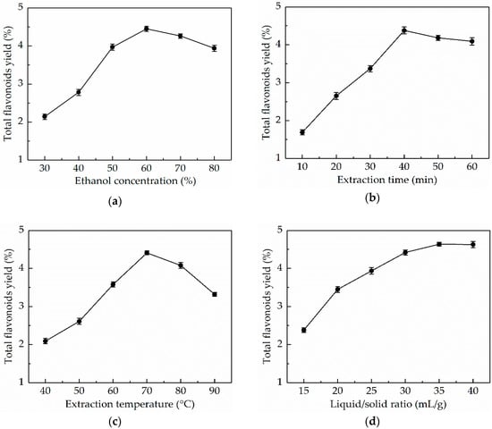In general, aqueous ethanol is an excellent solvent for the extraction of flavonoids from plants, and the selection of an appropriate ethanol concentration is a crucial step to improve extraction yield. In the present work, the impact of ethanol concentration on the TFY was studied first. As shown in Figure 1a, the TFY increased dramatically when the ethanol concentration varied from 30% to 60%. However, the extraction yield exhibited a downward trend when the ethanol concentration was above 60%, which was possibly due to the fact that higher ethanol concentration could more easily lead to dissolution of alcohol-soluble impurities []. Therefore, 60% ethanol was chosen as the best extraction solvent.