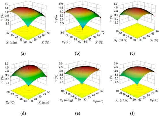 Figure 2a–f offered a visual interpretation of the interactions between two variables (X1X2, X1X3, X1X4, X2X3, X2X4, and X3X4) on the response variable (Y). Figure 2a–c showed the influences of ethanol concentration (X1) with extraction time (X2) and extraction temperature (X3) on the extraction yields of TF, respectively. The initial increase of X1 (50% to about 57%) led to an increase in TFY and followed by a decline thereafter (about 57% to 70%). Similarly, as could be seen from Figure 2a,d,e, a rapid rise in TFY was obtained when X2 varied from 30 to about 46 min, then the extraction yield of TF was decreased slowly with increasing extraction time. Figure 2b,d,f indicated that with an increase of X3 from 60 to about 74 °C, the TFY increased quickly, followed by a slight decline with further increase in X3. According to Figure 2c,e,f, it could be found that a maximum level of TFY was obtained at a X4 of 34 mL/g. The graphs also indicated that the influence of X4 on the TFY is insignificant (p > 0.05). In addition, as evident from Figure 2c, the interaction effect of X1 and X4 had a insignificant influence on the TFY from P. cretica (p > 0.05).