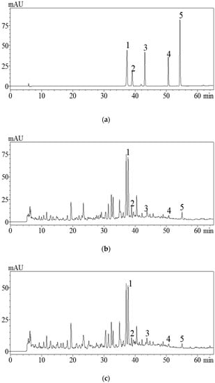 HPLC profiles of standards mixture (a) and P. cretica extract obtained by optimized ultrasonic-assisted extraction (UAE) (b). P. cretica extract obtained by heat reflux extraction (HRE) (c). Peaks (1): Luteolin-7-O-glucoside, (2) rutin, (3) quercitrin, (4) luteolin, and (5) apigenin.