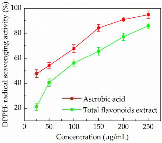The DPPH• radical scavenging capacity of total flavonoid extracts of P. cretica was investigated on the basis of the method reported by Shukla et al. [] with a minor modification. Briefly, 0.8 mL of the DPPH solution (0.1 mM in ethanol) was mixed with 2.4 mL of total flavonoid extract solution at different concentrations (25–250 µg/mL in ethanol). The reaction mixture was then shaken well and incubated at room temperature for 30 min. The absorbance of the reaction mixture was recorded at 517 nm. Ascrobic acid was used as a positive control in this work. The percentage of DPPH• radical scavenging was calculated using the following equation:
