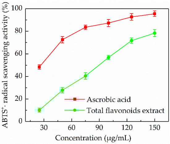 The total flavonoids content (TFC) was measured using the aluminium chloride colourimetric method reported by with slight modifications []. First, to 0.5 mL of the sample solution, 0.15 mL of NaNO2 (5%, w/v) was added. After the mixture was stirred for 5 min, 0.15 mL of (10%, w/v) AlCl3 was added. After another 5 min, 1 mL of NaOH (1 M) was added. The solution was then made up to a final volume of 5 mL by the addition of ultrapure water. After complete addition, the reaction mixture was further incubated at ambient temperature for 20 min, and the absorbance was immediately recorded at 510 nm with an UV-vis Spectrophotometer (UV-2600, Shimadzu, Kyoto, Japan). Rutin was used as a reference, and the TFC was calculated according to the regression equation: (R2 = 0.9997, final rutin concentration 18.12–72.48 µg/mL), where y is the absorbance, x is the content (µg/mL), and the TFY was calculated by the equation given below: