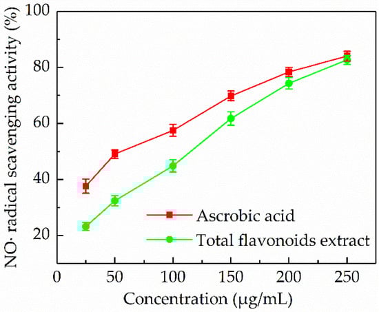 Despite the potential health benefits of NO• radical, its role in causing oxidative damage is becoming progressively prominent []. In this work, the scavenging effect of the P. cretica extract on NO• radical was studied. Figure 6 showed that the P. cretica extract within the concentration range tested (25–250 µg/mL) exhibited NO• radical scavenging activity in a dose-dependent manner. Especially, the P. cretica extract exhibited a maximum percentage scavenging of 82.71 ± 1.54%, which was comparable to the NO• radical scavenging activity of ascorbic acid. The IC50 value of ascorbic acid was 51.60 µg/mL, and for the P. cretica extract it was 89.12 µg/mL. Results indicated that P. cretica might serve as an excellent NO• radical scavenger due to the high level of flavonoids. It has been reported that the flavonoids are very powerful NO• radical scavengers [].