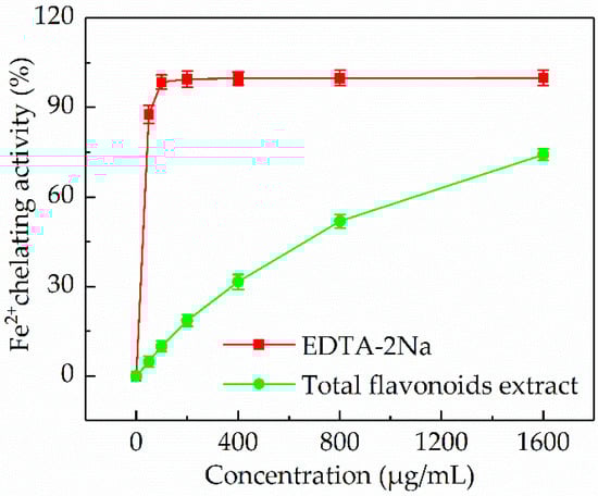 The ferrous ion chelating activity of the extract was measured using the modified method reported by Tohma et al. []. In brief, this assay was carried out by mixing 1.0 mL of extract solution (50–1600 µg/mL) with 0.1 mL of FeCl2 solution (2.0 mM), 0.2 mL of ferrozine solution (5.0 mM) and 2.7 mL of deionized water. After 10 min of incubation at room temperature, the absorbance of reaction mixture was recorded at 562 nm, and EDTA-2Na was used as a positive control. The Fe2+ chelating activity was calculated according to Equation (4).