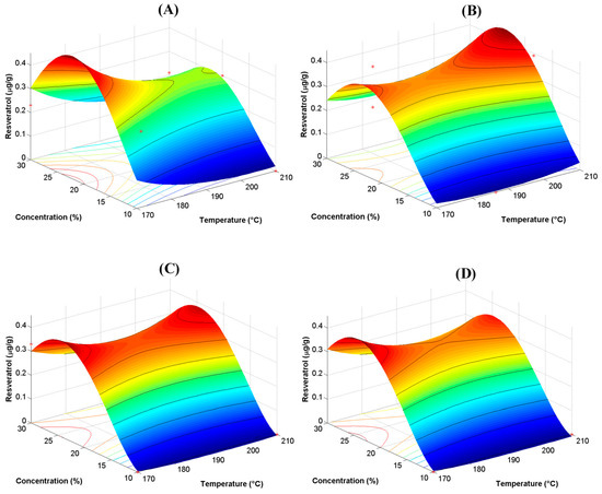 Response surface plots analysis (RSP) for the content of resveratrol as a function of the type of MX: (A) CM, (B) M10, (C) M20 and (D) M40. The symbols (*) in each RSP represent the center and start points for estimation of second order effects.