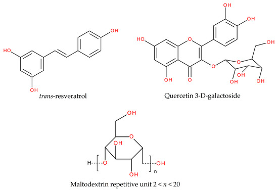 Schematic representation of chemical structures of resveratrol, quercetin 3-D-galactoside and the maltodextrin repetitive unit.
