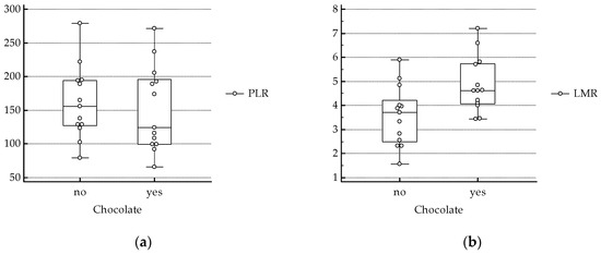 (a) PLR: platelet-to-lymphocyte ratio. No significant differences between chocolate consumers and non-consumers. (b) LMR: lymphocyte-to-monocyte ratio, Normality Test (Shapiro–Wilk) passed, two tailed T Test (chocolate yes versus no: p = 0.01).