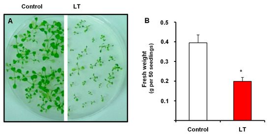 (A) Appearance and (B) fresh weight of the 14-day-old Arabidopsis seedlings grown in MS medium subjected to low temperature (LT) for the last 48 h. The results are the mean of at least three different experiments + SEM. For each experiment, 200 seedlings were used. * Differences in relation to the control values were significant at p < 0.05.