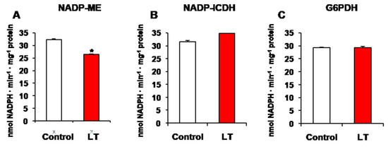LT usually induces nitro-oxidative stress, mediated by the overproduction of reactive oxygen(ROS) and nitrogen (RNS) species [1]. Interestingly, an increasing number of reports suggest that certain reduced nicotinamide-dinucleotide phosphate(NADPH)-generating dehydrogenases might be involved in the protection mechanism against nitro-oxidative stresses induced by adverse environmental conditions [17,18,19,20,21,22,23]. In plants, several NADPH-generating systems come into play, such as ferredoxin-NADP reductase as a component of photosystem I, and a group of NADP-dehydrogenases that have been found in different subcellular locations. This group of enzymes includes NADP-isocitrate dehydrogenase (NADP-ICDH), glucose-6-phosphate dehydrogenase (G6PDH), 6-phosphogluconate dehydrogenase (6PGDH) and the NADP-malic enzyme (NADP-ME), also called NADP-malate dehydrogenase.