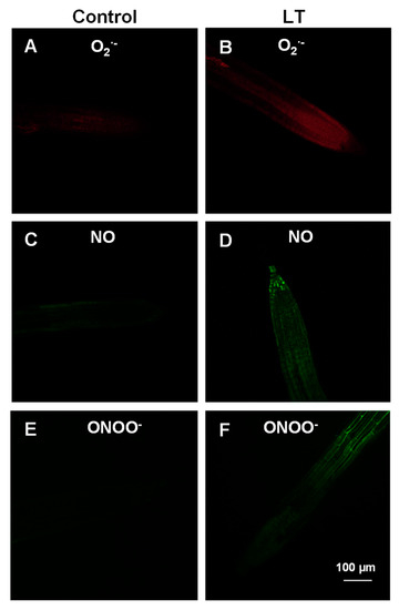 Fluorescence and confocal images showing the in vivo detection of superoxide radical (O2•−) (panels A and B), nitric oxide (NO) (panels C and D), and peroxynitrite (ONOO−) (panels E and F) in Arabidopsis root tips after exposing seedlings to low temperature (LT) for 48 h.