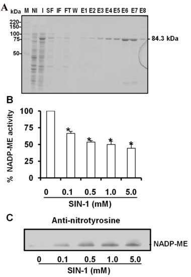 Purification of recombinant cytosolic NADP-ME2 and effect of SIN-1 (3-morpholinosydnonimine (peroxynitrite donor)) on its activity. (A) Purity of recombinant NADP-ME after expression and purification was evaluated by SDS-PAGE (10%) and Coomasie blue staining. M, molecular markers; NI, total protein in no-induced culture; I, total protein in induced culture; SF, soluble fraction; IF, insoluble fraction; FT, flow-through; W, wash; E1-E8, elution fractions. (B) Effect of SIN-1 on recombinant NADP-EM2 activity. (C) Representative immunoblot showing the degree of tyrosine nitration of NADP-EM2 treated with different concentrations of SIN-1 and detected with an antibody against 3-nitrotyrosine (dilution 1:2500). 3 µg of protein was used per line. The specific activity of recombinant NADP-ME was 9850 µmol NADPH min−1 mg−1 protein. Data are the means ± SEM of at least three replicates. * Differences from the control values were significant at p < 0.05.