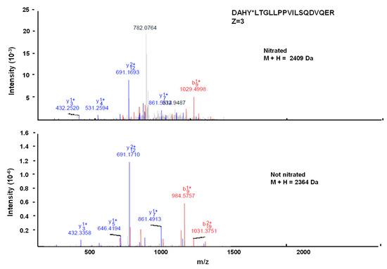 There are 25 tyrosine residues in the sequence of the cytosolic NADP-ME2 in Arabidopsis plants. Thus to be able to identify which of these residues is(are) (a) target(s) of this NO-related post-translational modification, the recombinant protein was treated with peroxynitrite, digested with trypsin, and the resulting peptides were analyzed by MALDI-TOF/TOF mass spectrometry. After the LC-MS/MS analysis, a list of scanned and identified peptides was obtained (Table S1), among which only one was identified to contain a nitrated tyrosine. Figure 5 shows the comparison of the nitrated (top) and unmodified (bottom) MS/MS spectra of these identified peptides from NADP-ME2. Nitrated peptide DAHYLTGLLPPVILSQDVQER (Z = 3) had 21 amino acids and a mass of 2409 Da (2364 Da, plus 45 Da), which is compatible with Tyr-73 nitration (Figure 5).