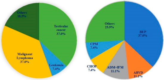 - Ghezzi, M.; Berretta, M.; Bottacin, A.; Palego, P.; Sartini, B.; Cosci, I.; Finos, L.; Selice, R.; Foresta, C.; Garolla, A. Impact of Bep or Carboplatin Chemotherapy on Testicular Function and Sperm Nucleus of Subjects with Testicular Germ Cell Tumor. Front. Pharmacol. 2016, 7, 673. [Google Scholar] [CrossRef] [PubMed]