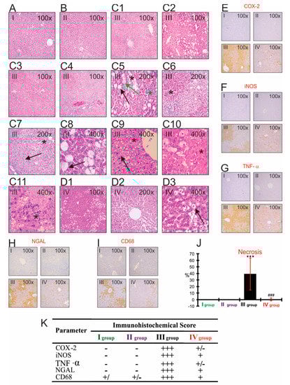 Effect of CCl4 and bilberry fruit extract on histopathology of rat liver after 24 h (H&E and Immunohistochemical staining). I-group I (untreated group), II-group II (treated group), III-group III (CCl4), IV-group IV (treated + CCl4). (A) group I (untreated group), 100×; (B) group II (treated group), 100×; (C1–C11) group III (CCl4); C1-Necrosis followed by minor and severe reversible change, 100×; C2-Necrosis followed by macrovesicular hepatocytes, 100×; C3-Necrosis followed by vacuolar hepatocytes, 100×; C4-Hemorrhagic coagulation necrosis, 100×; C5-Necrosis (🞲), macrovesicular hepatocytes (→), hydropic hepatocytes (→), inflammatory mononuclear infiltrate (🞲), 200×; C6-Hemorrhagic coagulation necrosis (🞲), 200×; C7-Necrosis (🞲), vacuolar hepatocytes (→), 200×; C8- macrovesicular fatty hepatocytes (→), 400×; C9-Necrosis (🞲), microvesicular fatty hepatocytes (→), 400×; C10-Necrosis (🞲), 400×; C11-Inflammatory mononuclear infiltrate (🞲), 400×; (D1–D3) group IV (treated + CCl4); D1-minor reversible change (hydropic hepatocytes), 100×; D2- minor reversible change (vacuolar hepatocytes) and extended sinusoidal spaces, 200×; D3-Hydropic hepatocytes (→), 400×; (E) immunohistochemical detection of COX-2, 100×; (F) immunohistochemical detection of iNOS (NOS2), 100×; (G) immunohistochemical detection of TNF-α, 100×, (H) immunohistochemical detection of NGAL, 100×; (I) immunohistochemical detection Kupffer cells identification marker-CD68, 100×; (J) morphometric analysis extent of the necrotic area on a selected H&E field in the liver. The data show the average value ± S.D. (%) for 10 fields at the magnification of 200× for each animal in each group (H&E staining); (K) semiquantitative evaluation of COX-2, iNOS, TNF-α, NGAL, and CD68 immunohistochemistry staining. Staining intensity was graded as: - (negative), +/- (weak positive), + (positive), ++ (strongly positive), or +++ (very strongly positive).