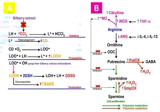 (A) The effect of CCl4 on lipid peroxidation; (B) the role of CCl4 on arginine metabolism and polyamine catabolism.