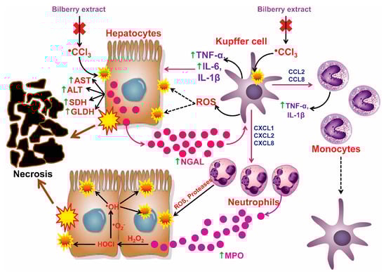 The results of this research confirmed that CCl4 caused a significantly increased level of the pro-inflammatory markers (TNF-α, IL-6, MPO, NO, NGAL) and the Kupffer cells identification marker (CD68), as well as immunohistochemical overexpression of pro-inflammatory mediators (TNF-α, COX-2, iNOS, NGAL, and CD68) in comparison to the results obtained from the untreated group, which is in accordance with the results presented in other similar studies [14,29,38,58,59,60]. TNF-α represents a pro-inflammatory cytokine, which has a major role in the pathogenesis of various acute and chronic liver disorders. During the inflammatory phase of the liver damage caused by the carbon tetrachloride, TNF-α contributed to the worsening of the damages provoked by the oxidative stress and inflammation [58]. TNF-α can activate hepatocytes, stellate cells, and endothelial cells, which attract and activate circulating inflammatory cells via released chemokines, which further stimulate the inflammation. On the other hand, TNF-α causes the cells’ necrosis by releasing the elastases and inducing ROS from the Kupffer cells. Moreover, TNF-α stimulates the release of NO from the liver macrophage by the induction of iNOS [49]. The activation and hyperplasia of Kupffer cells has a dual role—it is protective, but also potentially harmful. The protective role is based on the production of hepatoprotective cytokines (IL-10) in the hepatocyte regeneration process, and the harmful role is in the production of pro-inflammatory cytokines which significantly contribute to the pathogenesis of various chronic inflammatory diseases of liver-alcoholic liver disease (ALD), non-alcoholic steatohepatitis (NASH), and non-alcoholic fatty liver disease (NAFLD) [61,62]. In addition to its significant contribution to the process of lipid peroxidation, the trichloromethyl radical has a crucial role in the induction of the inflammation by activating the Kupffer cells in the liver. The activated Kupffer cells then produce and release a variety of inflammatory mediators (TNF-α, IL-6, IL-1β, PGE2, ROS, and eicosanoids), thereby reinforcing the damage of the parenchymatous liver cells [12]. Lipocalin-2 (LCN2) indicates an early biomarker of the liver inflammation, and its values are in correlation with the degree of the liver damage. Acute inflammatory and toxic damage of the liver, as well as the liberated pro-inflammatory cytokines (IL-1beta, IL-6, TNF-alpha) from the activated Kupffer cells, are powerful stimulants that induce the expression of LCN2 from the damaged hepatocytes. The most pronounced immunohistochemical detection of LCN2 is present in the centrilobular zone, which is consistent with the morphological distribution of hepatocyte damage in the liver acinus. On the other hand, the released LCN2 induces the Kupffer cells to release a different range of chemokines that attract the site of toxic damage and inflammation, neutrophils and monocytes [14,63,64]. The Kupffer cells attract neutrophils via CXCL1, CXCL2, CXCL8, and they attract monocytes to the center of inflammation and liver damage via CCL2 and CCL8 [60]. The attracted neutrophils releases ROS and proteases that further aggravate the damage causing necrosis. The increased activity of MPO in the liver homogenate, released from the activated neutrophils, confirms the morphological finding of inflammatory infiltration of neutrophils in the center of damage (Figure 3) [16,65]. The powerful antioxidant properties of anthocyanins, by neutralizing ●CCl3, reduce excessive activation of the Kupffer cells, which significantly contribute to the anti-inflammatory properties of the bilberry extracts.