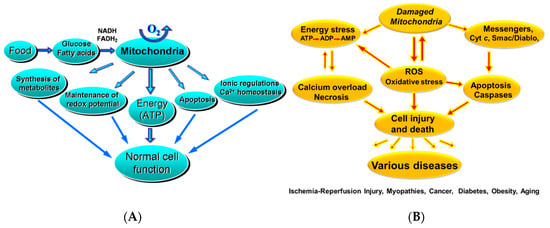 (A) The roles of mitochondria in normal cell function; and (B) in various cell damage/injuries. Mitochondrial function and dysfunction contribute to cell viability and injury by several mechanisms. ROS—reactive oxygen species.