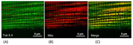 Fluorescence confocal evidence for the co-localization of the (A) tubulin beta II (Tub β II) (visualized by the specific antibodies against tubulin beta II, green), with mitochondria (Mito) (B) visualized by the specific mitochondrial potential-sensitive probe tetramethylrhodamine methyl ester (TMRM, red). Merged image (C).