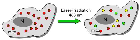 Exposure of cells loaded with the ΔΨm-specific probe tetramethylrhodamine methyl ester (TMRM, red) and 2,7-dihydrodichlorofluorescein diacetate (DCF-DA, green) to laser irradiation activates extensive mitoROS production, detected as a strong increase in DCF fluorescence, together with a collapse of mitochondrial ΔΨm, visible as a strong decrease in TMRM fluorescence (the appearance of green mitochondria). This effect can be used as a convenient tool for mitoROS generation and the induction of photo-oxidative stress and Ca2+ transients. Heterogeneity of mitoROS and ΔΨm has been demonstrated in various cells during IR, oxidative stress and photo-oxidative stress [112] (see Figure 5).