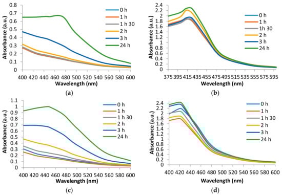 UV–visible absorption spectra of synthesized silver nanoparticles using tested solutions: (a) TS1—beech bark extract, pH = 4, AgNO3; (b) TS2—beech bark extract, pH = 9, AgNO3; (c) TS3—beech bark extract, pH = 4, AgC2H3O2; (d) TS4—beech bark extract, pH = 9, AgC2H3O2.