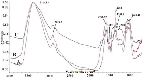Fourier transform infrared spectra of gold nanoparticles (AgNPs): A—TS2 (AgNPs obtained with AgNO3 at pH = 9), B—aqueous bark extract, C—TS1 (AgNPs obtained with AgNO3 at pH = 4).