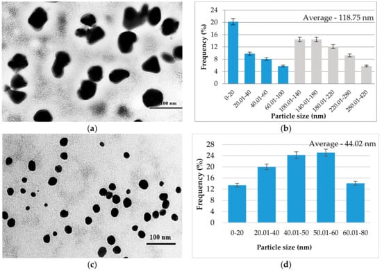Graphical representation of AgNP synthesized in the presence of the extract obtained from the beech bark and AgNO3: (a) TS1— TEM photomicrograph; (b) histogram of the distribution of the AgNP size distribution in the TS1; (c) TS2—TEM image; (d) histogram of the distribution of AgNP size distribution in TS2 (TS1—beech bark extract, pH = 4, AgNO3; TS2—beech bark extract, pH = 9, AgNO3).