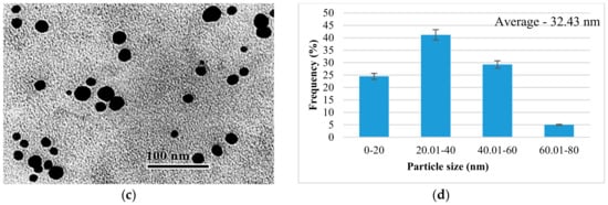 Analyzing the synthesized AgNPs in the presence of the extract obtained from the beech bark and AgNO3 (Figure 6), the results are similar to those presented previously. The morphology of the obtained AgNPs at pH = 4 (TS3) is varied, in this case observing polygonal, triangular, and spherical shapes (Figure 6a). In contrast, at basic pH (TS4) it can be observed that the AgNP morphology is constant, with only the spherical shape being met (Figure 6c). AgNPs obtained in the basic medium have dimensions in the range of 2–80 nm, with an average of 32.43 and 100% being smaller than 100 nm in diameter (Figure 6d).