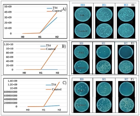 Graphical and visual representation of the growth rate for S. aureus (A,D), E. coli (B,E), P. aeruginosa (C,F) in the presence of TS4 (beech extract + AgC2H3O2 pH = 9) and in the absence of TS4 (Control) at: initial time—H0, 3 h—H1, and 6 h—H2.