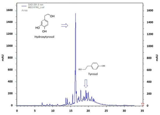 Conversely, the fractions eluted with the ethanolic mixture (PAD428-FR2 and PAD900-FR2) presented an intense red–brown color and gave again similar results in terms of polyphenols content (up to 4.12 g/L, recovery 80%) as shown by the PAD428-FR2 sample chromatogram reported in Figure 1, with hydroxytyrosol and tyrosol respectively 0.90–0.85 g/L and 0.10–0.08 g/L as reported in Table 2. However other biophenols were identified in PAD428-FR2 samples as shown in Table S2 (see Supplementary materials).